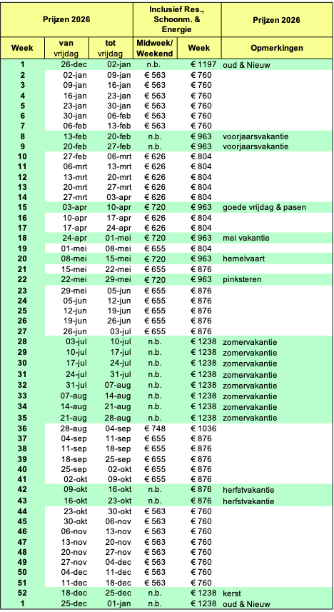 De huurprijs is inclusief reserveringskosten (€20,00), energiekosten (€80,00 per week en €45,00 per weekend of midweek) en schoonmaak (€84,00).
